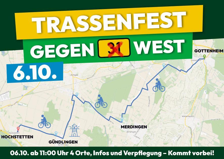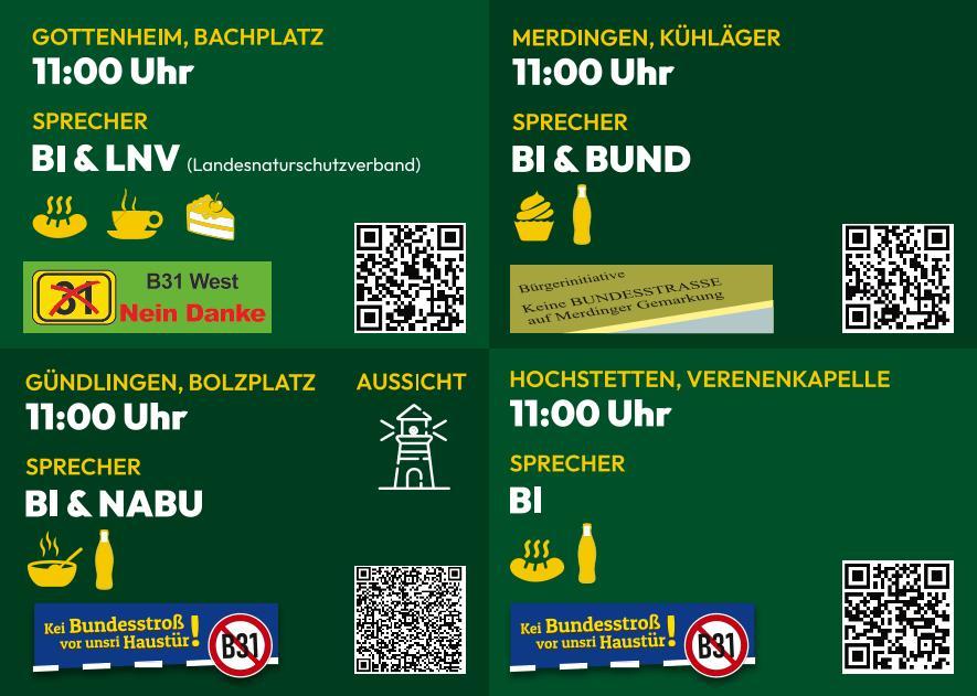 Wir sind mit der Aktion und unserem Anliegen nicht alleine. Gleichzeitig machen unsere befreundeten Bürgerinitiativen und Verbände aus Merdingen, Gündlingen und Hochstetten entlang der geplanten Straßentrasse auch mit. Wer möchte kann eine (Rad-)Tour zu deren Infoständen machen und sich so abwechlungsreich informieren, verpflegen lassen und unsere herrliche Landschaft, ohne die unsinnige B31 West, genießen.